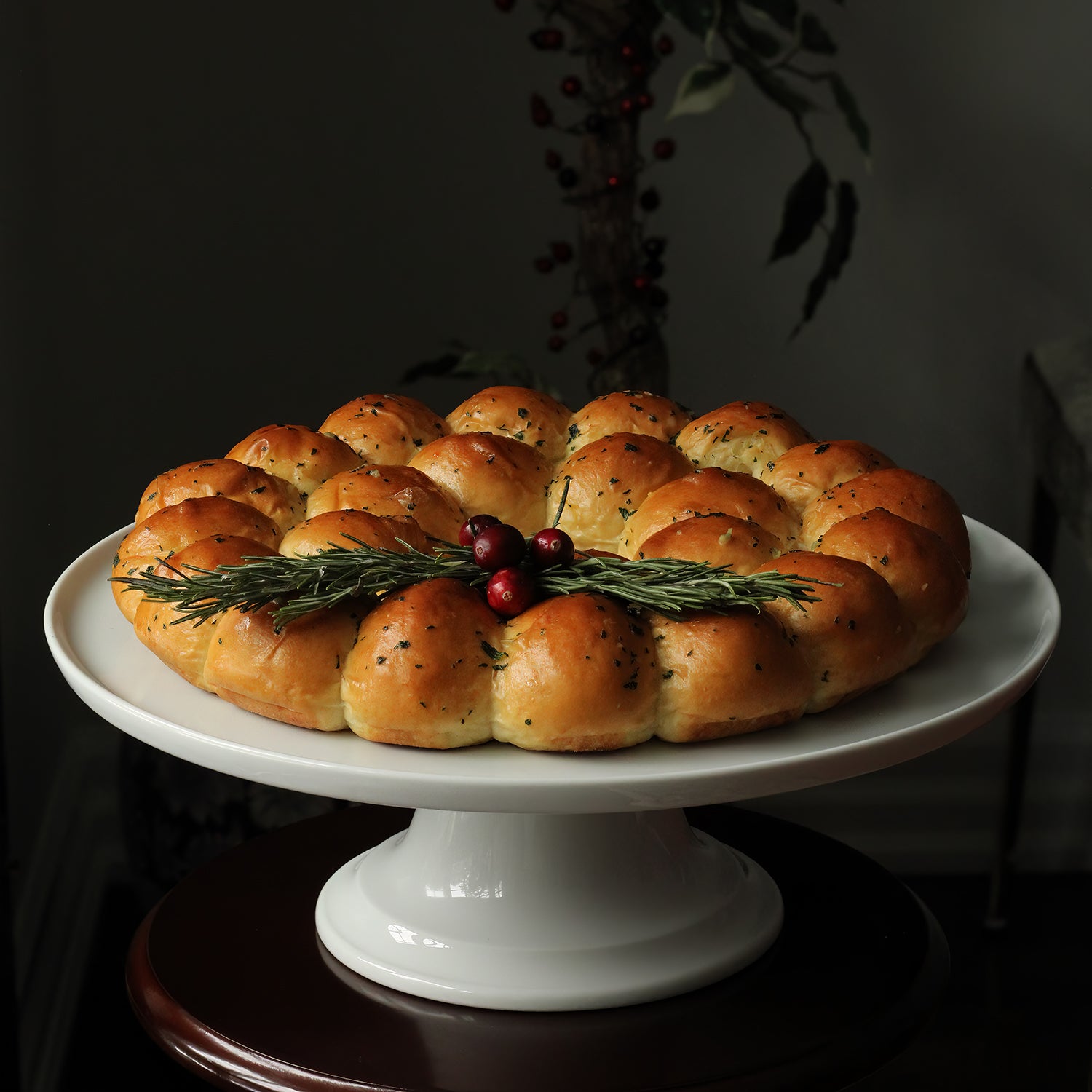 Making a return to the Holiday 2023 menu, the yummy wreath-shaped soft pull-apart bread in garlic/parsley or parmesan/rosemary flavours. Size: approx. 13" in diameter.